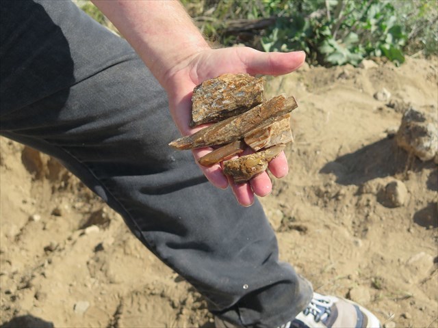 1. From the parking area, walk east to where others have dug for petrified wood and geodes. Describe the shapes, sizes, colors and texture of the petrified wood shards found in the spoils or disgarded mounds or describe any petrified wood shards you found?