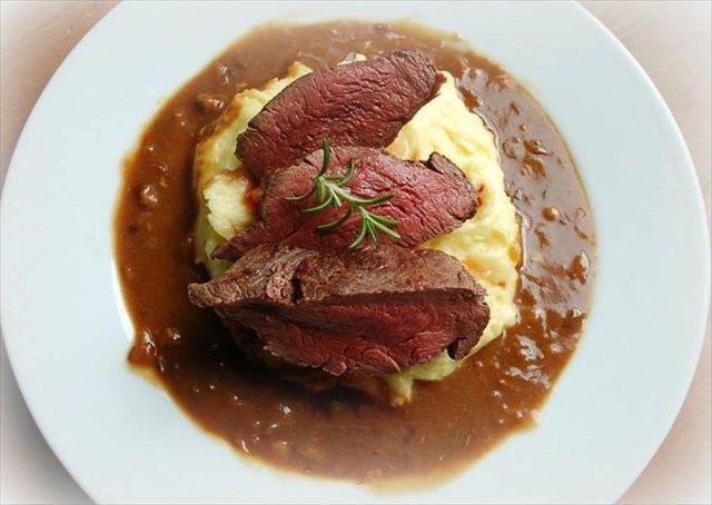 Maso jen posolíme a přidáme pepř, abychom si vychutnali chuť masa. Maso osmahneme asi 3-4 minutky ze všech stran a následně dáme do předehřáté trouby (na 180) asi na 20 – 25 min. Záleží na výšce masa a taky na tom, jak moc propečené maso chcete. Ve výpeku z masa osmahneme nadrobno nakrájenou cibulku, dokud nezezlátne a zaprášíme trochou mouky a přidáme asi 2 dcl hovězího vývaru. Přidáme utřený stroužek česneku, snítky rozmarýnu a trošku sojové omáčky. Necháme provařit a trošku zredukovat vývar. Potom už nezbývá než vyndat maso z trouby a nechat ho chvíli odpočnout, než ho rozkrojíme, aby se šťáva hezky rozlila celým steakem. Podáváme s bramborovou kaší.
