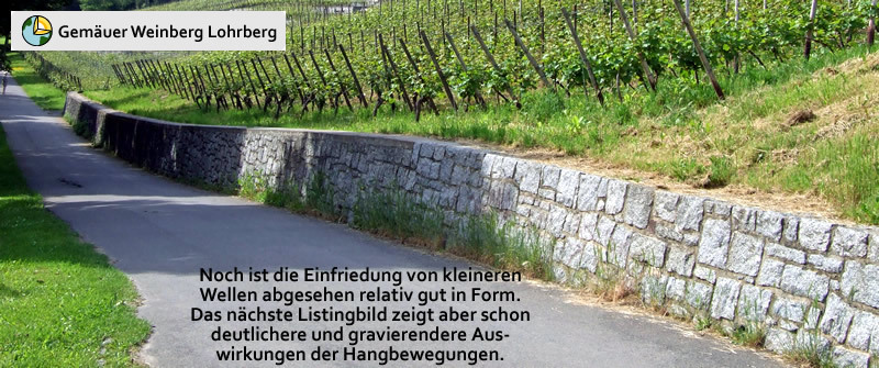 Auch hört man hin und wieder in den Meldungen von Hang - oder auch Bergrutschen, den sogen. Massenbewegungen. 1990 veröffentlichte das Stadtvermessungsamt Höhenmessungen der vergangenen zwölf Jahre. Sie ergaben, dass der Lohrberg pro Jahr um einen Zentimeter rutscht. Auf dem Weg zwischen den Weinstöcken konnten schon seit Jahrzehnten Bewegungen der Einfassungsmauern beobachtet werden. Diese Erkenntnis ist indes nicht neu, denn darüber wird in Seckbachs Chronik bereits aus früheren Jahrhunderten berichtet. Seinerzeit kam es sogar zu mindestens einem größeren Bergrutsch. Berichten zufolge rutscht demnach dieser Hang etwa 1 cm pro Jahr und das möchten wir euch gerne einmal zeigen. Also beschäftigen wir uns in diesem EarthCache damit und führen euch zu einem Ort, wo solch ein Rutschen des Hanges besonders ausgeprägt sichtbar und für jederman nachzuvollziehen ist.
