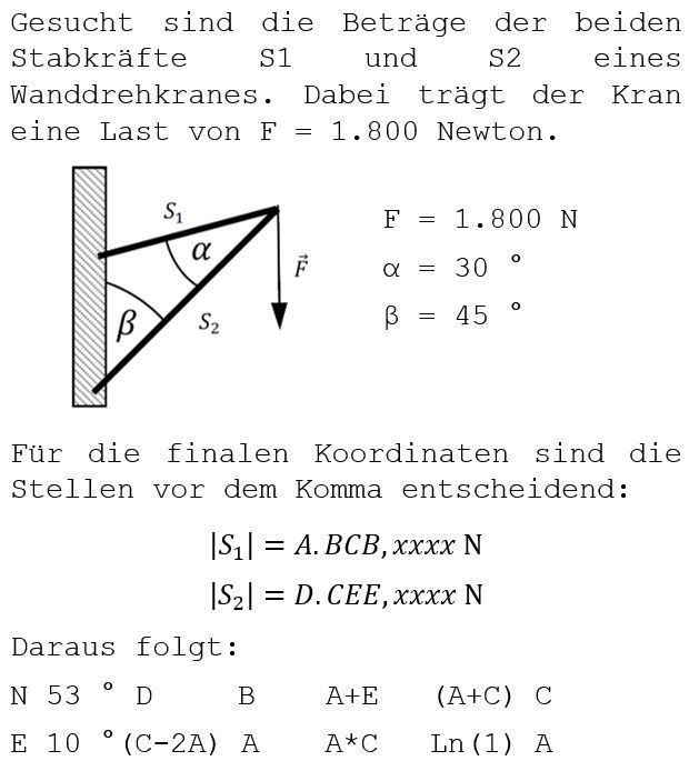Versucht zuerst S1 und dann S2 zu berechnen. Die Angabe erfolgt in Newton. Zu empfehlen ist es durchgängig mit vier Nachkommastellen zu rechnen, damit es zu so wenig Abweichung wie möglich kommt.