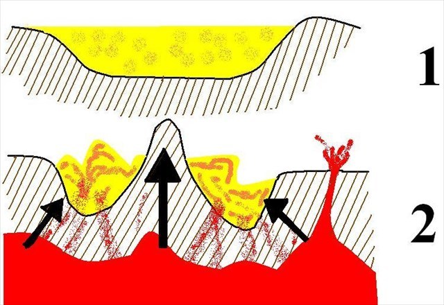 Durant des millions d'années, à leur mort, tous ces animaux et plantes, mélangés aux planctons se sont entassés au fond de l'eau s'accumulant dans des cuvettes.