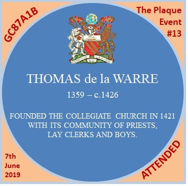 This plaque commemorates Thomas de la Warre 1359-c1462