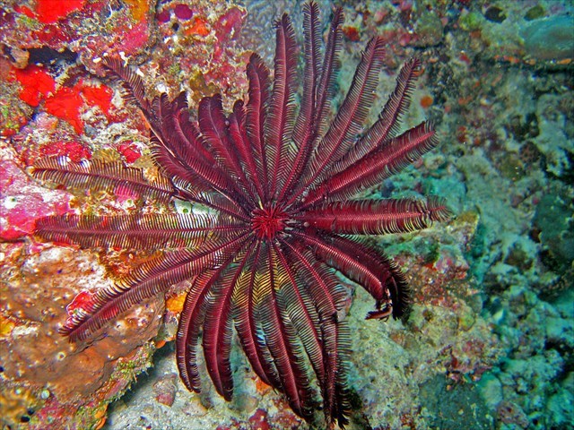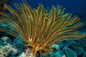 Crinoids look's like Flowers, in their adult form some are attached to the sea bottom by a stalk and are commonly called sea lilies, while the unstalked forms ( free-swimming ) are called feather stars or comatulids, being members of the largest crinoid order Comatulida. Adult crinoids are characterised by having the mouth located on the upper surface. Although the basic echinoderm pattern of fivefold symmetry can be recognised, in most crinoids the five arms are subdivided into ten or more. These have feathery pinnules and are spread wide to gather planktonic particles from the water.