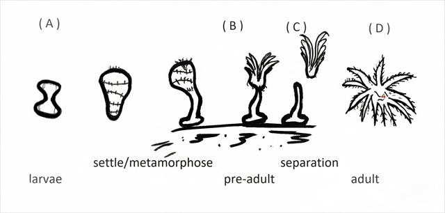 The re-production of the Comatulida group starting there life as a doliolaria larvae ( A ), it settles and begins to transform to becomes a weird proto-larvae. As the cystidean larvae gets larger it actually starts to develop a base, a stalk and a feeding cup ( B ). THEN, as the larvae grows, the TOP cup part, starts to form little cirri/legs and as it gets bigger and bigger...the cystidean starts to look more like a little tiny stalked crinoid. Once the feeding arms and etc. have become fully formed, it reaches what's called the pentacrinoid stage ( C / pre - adult ). The top, cup segment of the pentacrinoid stage develops until the little cup matures separates from the stalk and the "cup" becomes a free-swimming adults. ( D )