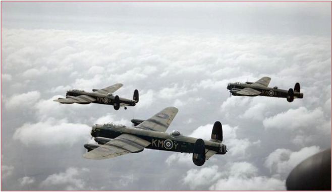 Formatie van drie Lancaster Mk.III van het 44 (Rhodesia) Squadron.