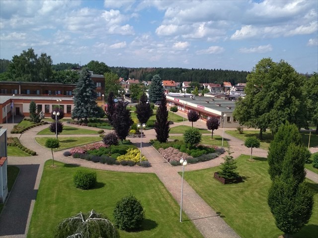 V těsné blízkosti náměstí se nacházejí budovy základní občanské vybavenosti - zdravotní středisko s lékárnou, obecní úřad, kulturní dům s kinem a knihovnou, pošta, obchody a služby, restaurace, autobusová zastávka a společenský sál. Dále od náměstí se nachází Základní a mateřská škola a fotbalové hřiště s tenisovým kurtem a dětským hřištěm. Další dvě veřejnosti přístupná dětská hřiště se nacházejí v blízkosti panelových bytových domů, které spolu s řadovými domky tvoří velkou část obytných domů v obci.