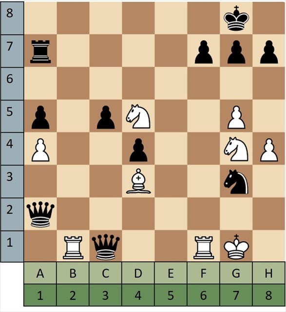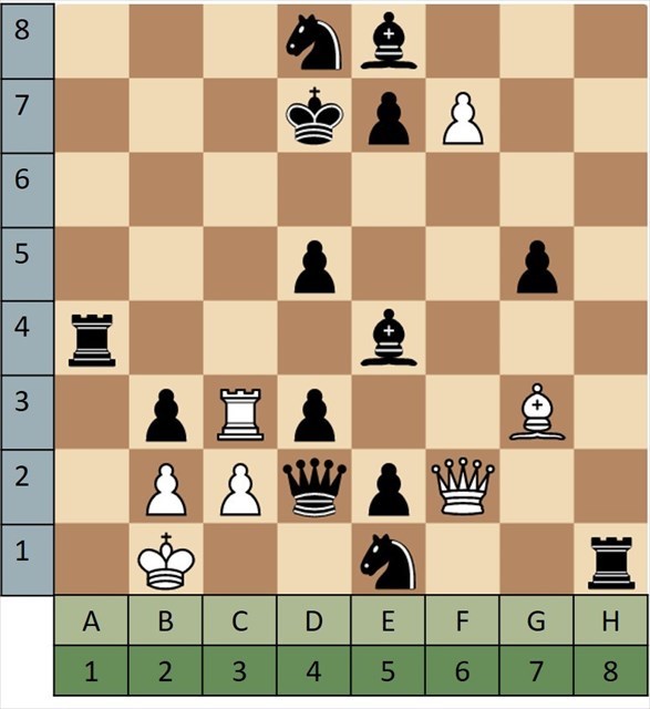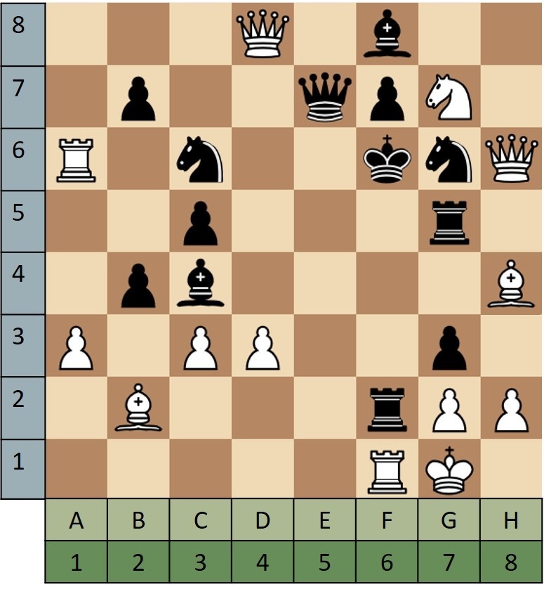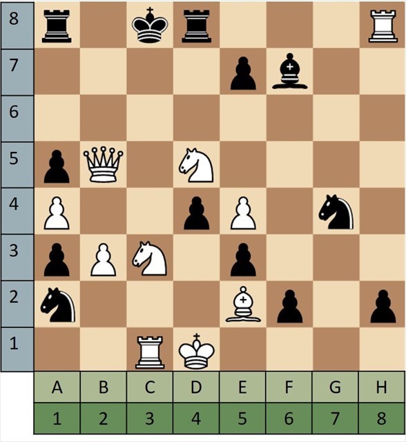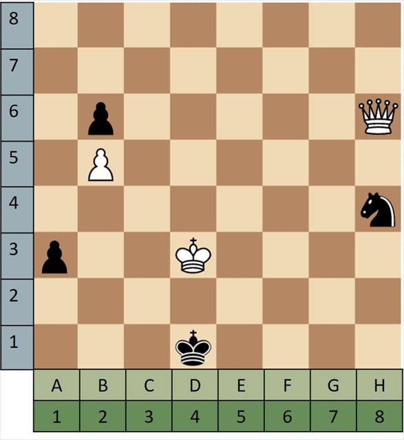 For each puzzle you are playing as white, it is your move, and it's checkmate in a single move. Note the square you are moving to for the win, (D2 in the example puzzle 'A'). You always write the file/column (light green letter) first, then the row (blue number) second. Take the answer, D2, and change the letter into a number based on what place it has in the alphabed. D would change into 4 since it's the 4th letter. 42 would replace AA in the coordinates.