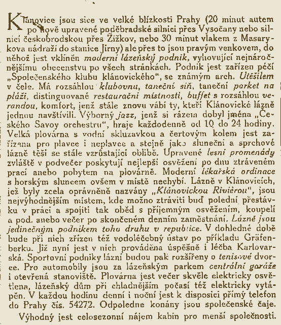 Klánovické lázně (také Klánovická riviéra) byly vedle golfového areálu nejvýznamnějším důkazem meziválečné a válečné prosperity lesní obce Klánovice. Po svém dokončení v roce 1926 byly lázně moderním relaxačním komplexem uprostřed Klánovického lesa. Plný provoz zde fungoval do roku 1948, v roce 1988 byla budova zbořena. Na jejich místě dnes stojí rodinné domky.