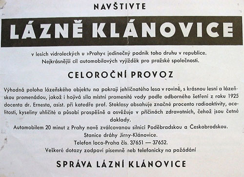 Lázně byly koncipovány jako společenské centrum pro významné osobnosti pražské společnosti. Využívaly toho, že Klánovice byly už v této době snadno dostupné jak autem, tak také vlakem. Hlavními lákadly pro klienty byla kombinace zdravého lesního vzduchu společně s léčivou radioaktivní vodou z vlastních hlubinných vrtů (kromě v té době populární radioaktivity se voda vyznačovala také vysokým obsahem kyseliny uhličité). Voda byla čerpána z podzemních vrtů pomocí větrné energie..