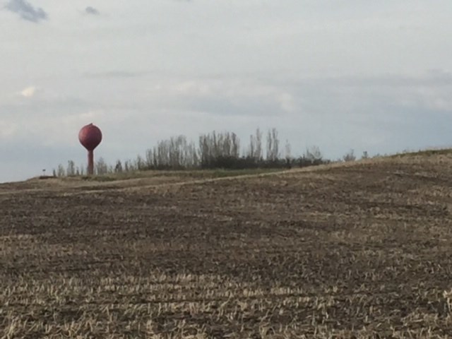 You can see this distinctive red water tower as you drive into Drumheller from the West. This is the water tower for the medium-security prison known as the "Drumheller Institution," which has been here since 1967. You can see the water tower to the East and slightly to the South from the cache location. We could have placed it closer, but were a little hesitant about placing a cache TOO close to the prison grounds. Range Road 201, just to the South of the cache location, is a public road however, so you are welcome to drive to the East on it and see the water tower close up. This water tower looks very similar to the one in Airdrie, except for the colour.