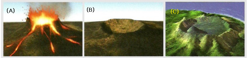 (B) 약 1만년 전 대폭발과 함께 지하 내부에 빈 공간이 생기자 화구가 크게 함몰하여 칼데라인 분지가 형성되었다. When a large explosion created an empty space deep underground about 10,000 years ago, the crater collapsed in a large scale and a caldera, Nari basin, was formed.