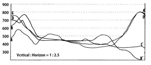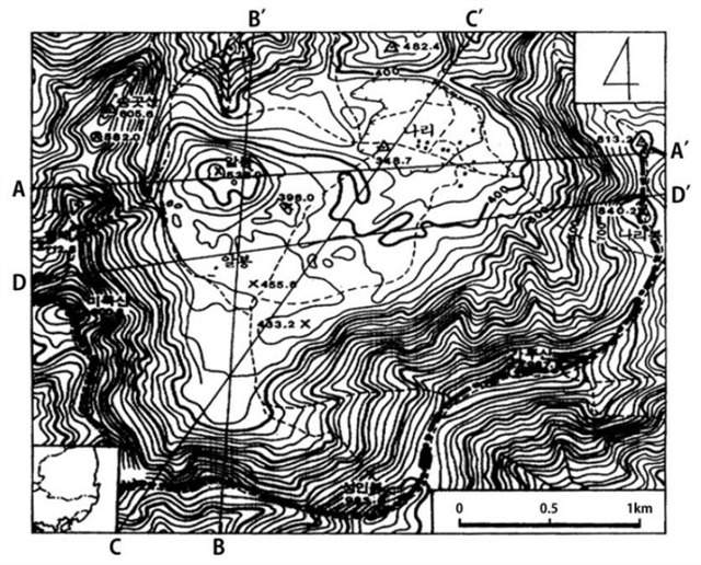 Two images(Topographic map & Cross-sectional diagram) refer to the double volcanoes of Ulleungdo island. You can see Albong peak in the middle of Nari basin with a wide contour line. When we compare two images, you can notice that the hilltop in the middle between AA 'and BB' in the section is Albong peak.