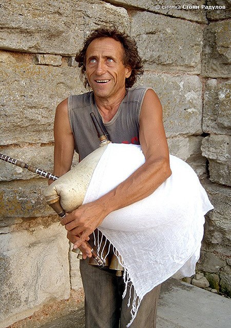 Това е самобитният гайдар - Петър Бонев. Най-често може да го видите в градинката между СУ и НС в София. А през лятото - в Несебър, където и го снимах. Докато свири и подрънква с чановете си, казва за себе си, че не е уличен музикант. Предпочита да го наричат небесен музикант с гайда и чанове, артист на свободна практика, разказвач или народен артист.