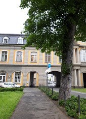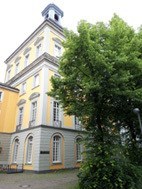 Wir gelangen zur Schlosskirche, die man auf den ersten Blick von außen nicht erkennen kann. Hier wurde ich vom Komponisten Christian Gottlob Neefe an der Orgel unterrichtet. Schon mit 14 Jahren hatte ich hier meine erste Anstellung als kurfürstlich-kölnischer Hoforganist. Vor dem Eingang zur Kirche findet ihr den Studentenbrunnen. Oben sind die vier Fakultäten Theologie, Philosphie, Jurisprudenz und Medizin dargestellt. Im unteren Brunnenteil kann man acht Szenen aus dem Studentenleben erkennen. Leider sind die Inschriften teilweise unleserlich geworden. Zu den Texten gehören: "Auf der Mensur", "Zu Askalon", "studierender Jüngling", "Sport", "Nachtwächter" und "Studentin". Wie lauten die beiden fehlenden Texte? Wie viele Buchstaben haben beide Bezeichnungen zusammen? = F