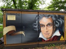 Die Bonner haben auch eine große Konzerthalle nach mir benannt. Leider ist sie aktuell zur Großbaustelle geworden. Ich komme zum 300. Geburtstag wieder, da wird sie dann fertig sein. An der Hauptstrasse hat ein Künstler mein Konterfei auf einen Stromkasten/Trafokasten gemalt. Auf der Rückseite seht ihr verschiedene Noten. Gesucht ist die Anzahl der Sechszehntelnoten. = O