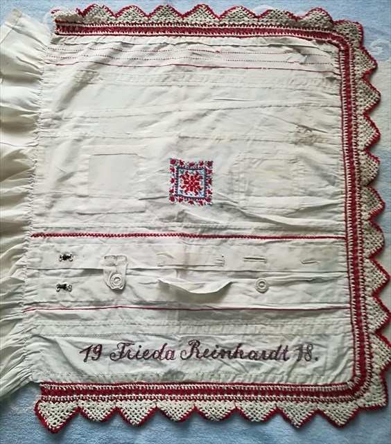 Frieda hat im Jahr 1918 als Teenie, vermutlich in der Schule ihr komplettes Handarbeitswissen in einem Stück Stoff von ca 50x50 cm verewigt.