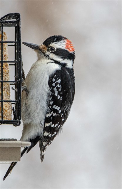 The Hairy Woodpecker is very similar in appear to the Downy but larger in size and with a longer beak. It often comes to eat suet at my bird feeder but is shyer than the Downy.