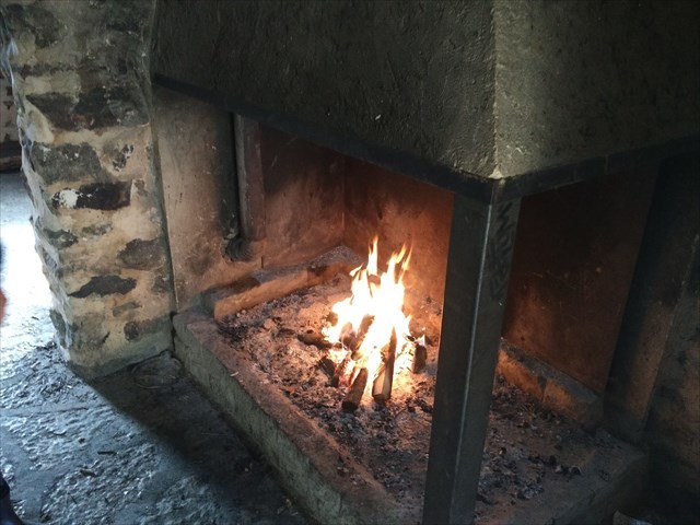 - una gran sala con una mesa de madera con banquetas a los lados, con cabida para ocho personas, y una enorme chimenea con perfecto tiro, donde poder calentarse o cocinar.
