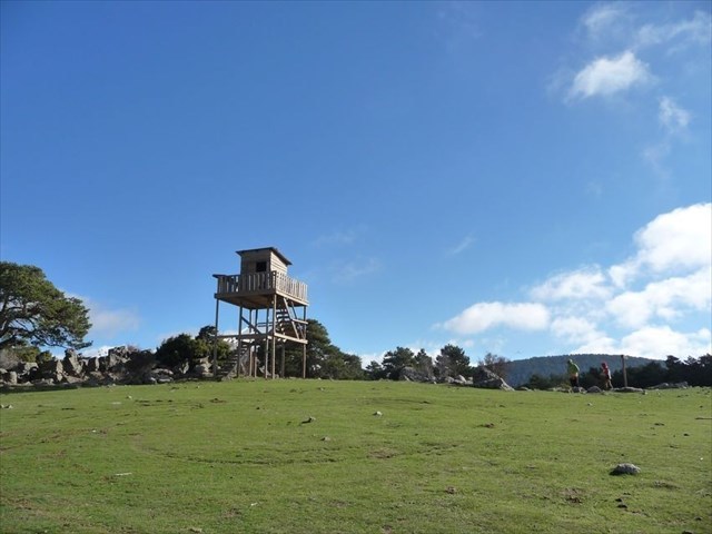 Y a unos 50 metros está el Mirador de La Portera, una torreta de madera, desde la que se puede apreciar el maravilloso paisaje de los Montes Universales. Y gracias a sus paneles informativos podemos poner nombre a todo lo que vemos.