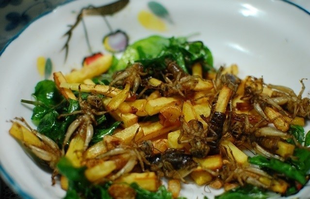 Recept starý jako jezení cvrčků samo. V části Číny a Taiwanu je cvrček nadívaný sladkou bramborou národním jídlem. Chuťově vyniká cvrček, lépe se zpracovává masité saranče. Umyjeme a spaříme ho(tím se vyprázdní a usmrtí). Sladký brambor očistíme a nakrájíme do tvaru úzkých hranolek nebo klínků. Velikost volíme tak, abychom na něj snadno napíchli cvrčka nebo saranče a přitom ho nerozmáčkli. Připravený hmyz pečeme nebo smažíme, až do změknutí brambory. Současně si můžeme osmažit listy bazalky. Doporučuje se olivový olej. Směs lze vylepšit oříšky nebo semínky slunečnice. Podáváme na salátovém lůžku, s dippem nebo dressinkem. U sarančat si musíme dávat pozor, abychom ukousli poslední část nožiček. Jsou pokryty velmi ostrou pilkou, kterou se hmyz drží na listech a při jezení může pěkně poškrábat krk.