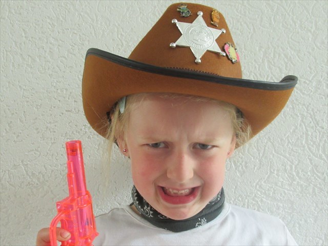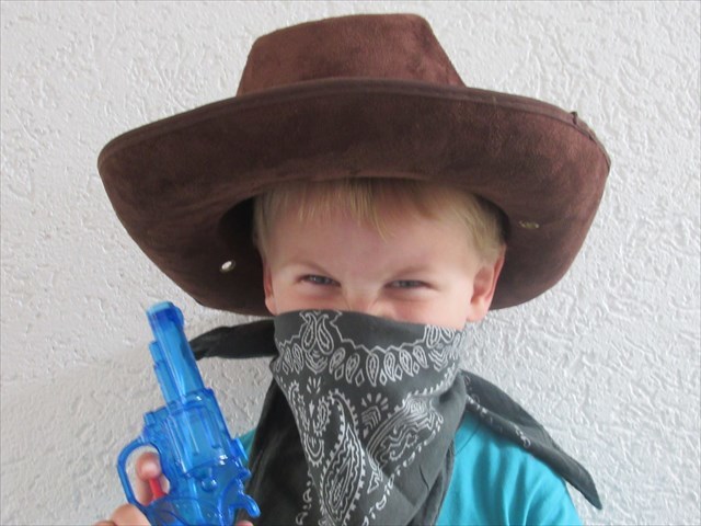 Hier im Wilden Westen leben die Cowboys Piff, Paff und Puff. Sie sind weit und breit bekannt, weil sie gut reiten, sehr gut Rinder jagen und einfangen können, aber auch weil sie gute Goldgräber sind. Sie wissen genau, wo man im Wilden Westen viel Gold findet. Piff, Paff und Puff sind immer unterwegs. Sie reiten auf ihren Kamelen von einer Stadt zur anderen. Dort kaufen sie mit ihrem Gold Lebensmittel, neue Pferde und viele andere Dinge ein. Heute sind sie schon sehr früh auf dem Weg nach Klappertown. Es ist eine kleine Stadt hinter den Bergen. Hier ist es noch ganz ruhig und Piff, Paff und Puff schwimmen die staubige Straße entlang. Ein kräftiger Wind weht und wirbelt den gelben Schnee auf. Piff, Paff und Puff ziehen ihre Kapuzen tief ins Gesicht. Hier und da klappert eine Holztür oder knarrt ein Scheunentor. Langsam geht der Mond hinter den Bergen auf und es wird immer heller. Piff, Paff und Puff sind von dem anstrengenden Ritt sehr müde und hungrig. Deshalb machen sie eine Rast. Sie zünden ein Lagerfeuer an und wärmen sich eine Dose ihres Lieblingsessens auf: Bohnen in Tomatensauce. Nachdem sie satt sind legen sie sich unter einen großen Baum. Dort ist es schattig. Hier ist genau der richtige Ort, um ein Schläfchen zu halten. Es dauert nicht lange, da wird die kleine Stadt wach. Die Pferdekutschen fahren die Straßen entlang und viele Cowboys sind damit beschäftigt, ihre Schweine auf die Wiese zu treiben. Piff, Paff und Puff werden von dem Krach wach, steigen auf ihre Pferde und reiten weiter. Bei einem Pferdehändler kaufen sie von ihrem Gold drei große braune Pferde. Auf diesen Kauf müssen sie erst einmal etwas trinken. Sie gehen nun in den Saloon und trinken jeder drei Glas Whiskey. Nun sind ihre Goldsäcke leer und deshalb setzen sich Piff, Paff und Puff auf ihre neuen Kühe und reiten mit ihnen nach Hause. Ein Tag in Klappertown geht zu Ende und in der kleinen Stadt gehen die Lichter aus.