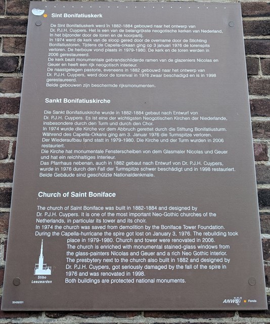 This neo-Gothic church was built in the years 1882-1884 by the renowned architect Petrus Cuypers. The church is in the form of a Latin cross building. The longitudinal axis is east-west, the choir is on the east side of the nave. The three-aisled basilica has a length of 75 metres and the transept is 33 meters wide. Cuypers has in many ways the symbolism of the divine Trinity in the church processed. The tower is with his 85 metres the highest church tower in Friesland. The tower consist of twe square sections and an actagonal lantern. The spire fell off during a severe storm on January 3, 1976. On March 26, 1980 the restoration was completed and the Boniface Church again extended above the rooftops of Leeuwarden. The western parish is among others used as a parisch centre and office of the Foundation Boniface Tower, which owns the complex.