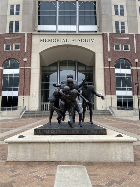 The statue depicts 6 Husker defensive players tackling a Kansas State player. The statue shows great teamwork and determination. The statue was created by Fred Hoppe in 1997 commemorating the Universities 4 National Championships in football.