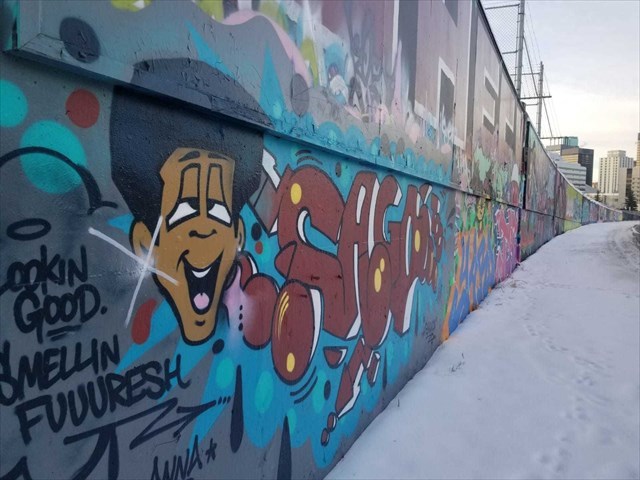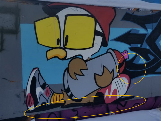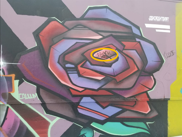 3. As this is a living wall, artists add to it regularly, sometimes multiple times per day. Your task is to find your favourite piece of art and determine how old it is. (hint: does it have much graffiti over top of it or is it overlapping other pieces) Include a close up of your favourite piece indicating the overlaps that helped you determine the age.