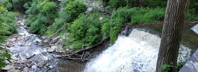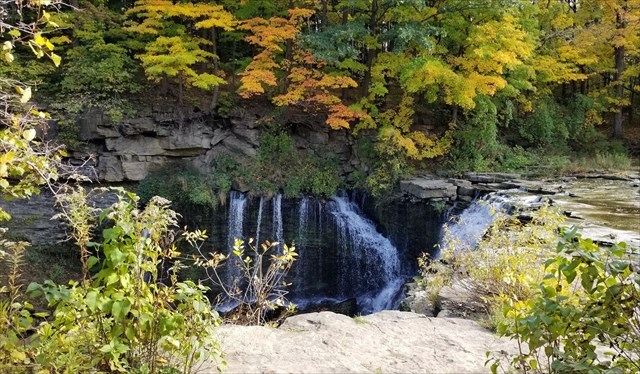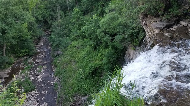 Also known as Grindstone, Waterdown, or Great Falls. They all describe the same beautiful ribbon waterfall in it's leafy forest setting that flows from Grindstone Creek in Waterdown, Ontario. At 10 metres tall, this isn't the area's biggest waterfall, but this short and fast-flowing waterfall is surrounded by a great section of the Bruce Trail. It has a rugged footpath tracing it's way up and down the ravine formed by the Niagara Escarpment. Once used to power a local sawmill, the falls are now the centre of beautifully rehabilitated park land.