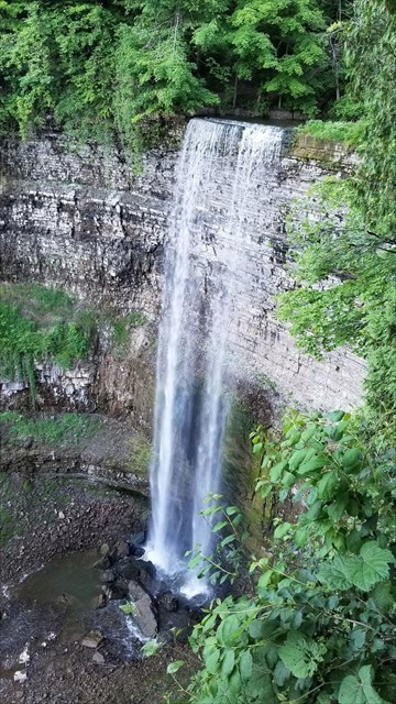 It is a ribbon waterfall, measuring 37 metres (121 feet) in height and has a crest width of 3 metres (10 feet). The creation of the punchbowl occurred at the end of the last ice age by huge melt-water rivers which rushed in torrents over the Stoney Creek Escarpment, thus carving the bowl and gorge. Here you will see colorful layers of stratified rock in a beautiful vertical display. There is a spectacular view of Stoney Creek and Hamilton Harbour from the lookout, not to mention the view down into the seemingly bottomless gorge.