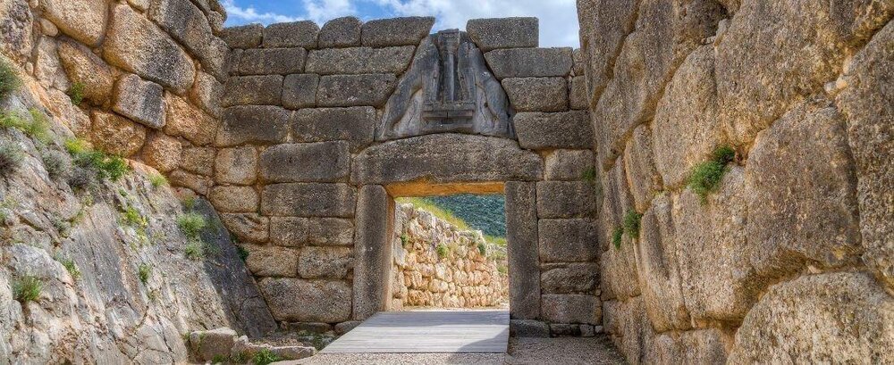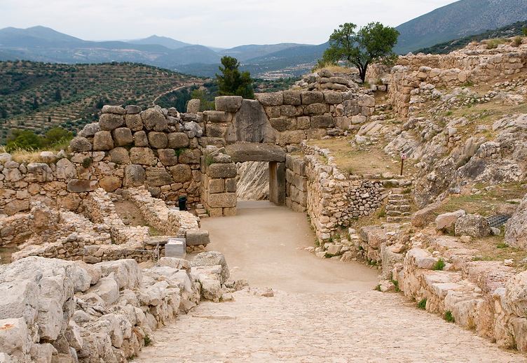 Η κύρια είσοδος της ακρόπολης των Μυκηνών, του κύριου κέντρου του Μυκηναϊκού Πολιτισμού. Η πύλη κατασκευάστηκε στα μέσα του 13ου αιώνα π.Χ., κατά τη διάρκεια της δεύτερης επέκτασης των οχυρώσεων στις Μυκήνες όταν βασιλιάς ήταν ο Ατρέας.