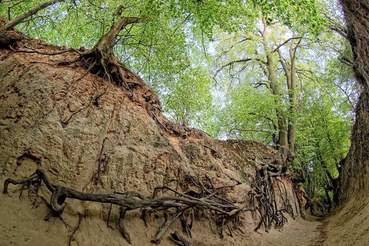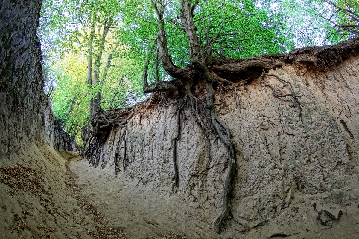 We were upstairs, now we will go a little lower ... It will be more mundane :) From Bochotnica east and south there is a geological phenomenon on a European scale - the so-called land of loess gorges. This is an area of very numerous occurrences of flat-bottomed ravines formed in the loess and often deep steep slopes. The gorges are usually overgrown and densely wooded, forming a natural walking alley. The most beautiful are considered to be those around Kazimierz Dolny, Bartłomiejowice and Bochotnica. The most famous gorge is probably the Korzeniowy Dół (Roots Gorge).