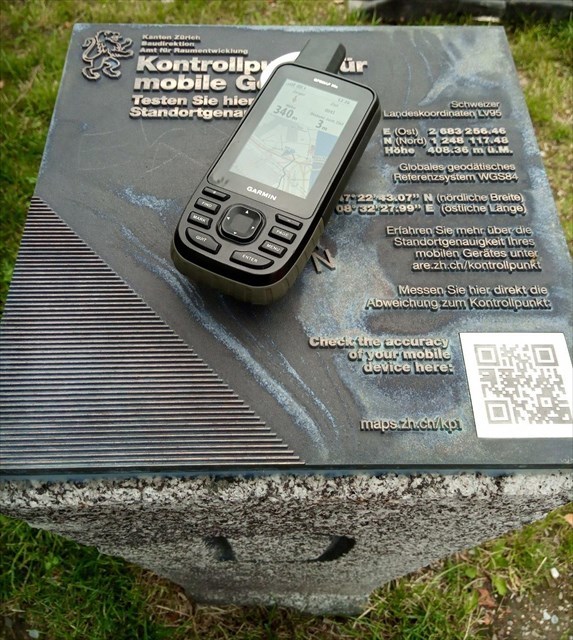 Beim Kontrollpunkt kannst Du die Genauigkeit Deines Smartphones oder Navigationsgerätes überprüfen. Als Geocacher wissen wir selbstverständlich, wie wir uns die aktuellen Koordinaten anzeigen lassen können. Alternativ kann vor Ort aber auch der dort angebrachte QR-Code eingelesen werden; die daraufhin angezeigte Webpage des Kantons zeigt dann die gemessenen Koordinaten (sogar in beiden Koordinatensystemen) und die Abweichung an.
