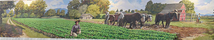 The mural was painted as a pastoral: bright and colorful, barefoot children playing, hard-working families farming the land, all in the beautiful Fraser Valley we call home. The mural begins with a long gravel driveway that lines a strawberry field. A woman is picking berries and pauses in her efforts to make eye-contact with the viewer. Farmhands fill the oxcart and plow the land with their team of draft horses in preparation for a new crop. Mt. Cheam and Mt. Baker make a great backdrop for the many lush crops of that era including hops, raspberries, corn and tobacco.