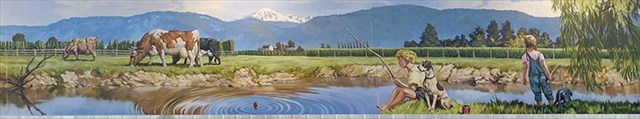 A young boy and girl are fishing in the Sumas canal. The blonde–haired boy, along with his faithful companion, concentrates on his bobber. The water ripples out, as did the concept of the mural, for this was the starting point of the design.