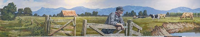 The mural’s theme is meant to celebrate Abbotsford’s agricultural heritage, by depicting a variety of scenes from our countryside, including crops, farmhouses, a child fishing, and farmers tending to animals. By 1930, Sumas Lake had been drained into the Fraser River and was developed into farmland creating the Vedder and Sumas canals. The 1940’s saw the immigration of foreign landowners starting family farms, including the Dutch/Mennonites, depicted by the girl feeding chickens in her clogs.