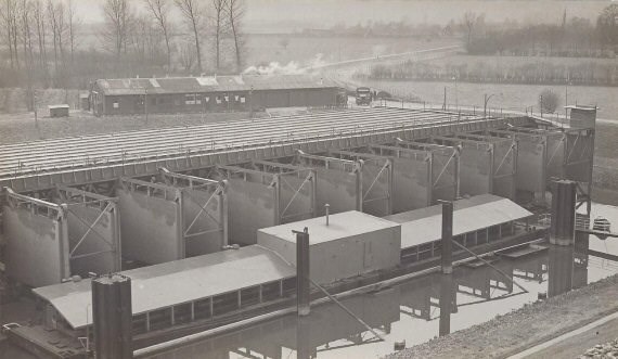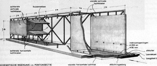 Voor de Waalstuw werden 26 van die secties gebruikt, waardoor een caisson van circa 230 meter lengte (zo breed is de rivier ter plaatse), 9 meter hoogte en 30 meter breedte ontstond. Voor zowel Rijn als IJssel waren 10 van die secties nodig. De benodigde proeven werden genomen in het Waterloopkundig Laboratorium in Delft, met een model op schaal 1:10 en met een enkele echte pontonsectie in de schutsluis naast de stuw bij Lith aan de Maas. In geval van oorlogsdreiging moesten die caissons tot zinken worden gebracht boven een geprepareerde vlakke asfaltlaag in de rivierbodem. Ze pasten precies tussen twee landhoofden, die via pijlerdammen in verbinding stonden met de vaste wal. Zowel de pijlerdammen als de caissons waren voorzien van beweegbare kleppen die na het afzinken systematisch moesten worden gesloten.