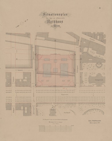 This city expansion fund (1858 - 2017) offered the city several plots of land for the new construction of the town hall, including behind the stock exchange (approx. 7200 m²) and across from the city park between Johannes- and Weihburggasse (approx. 14,600 m²). Interesting - the square across from St. Stephen's Cathedral, subsequently built with the "Haas-Haus" (Haas & Sons carpet store) from 1866, was also briefly discussed. The city finally decided, including a payment of 250,000 gulden, for the city park area, for which the building tender was issued in 1868.