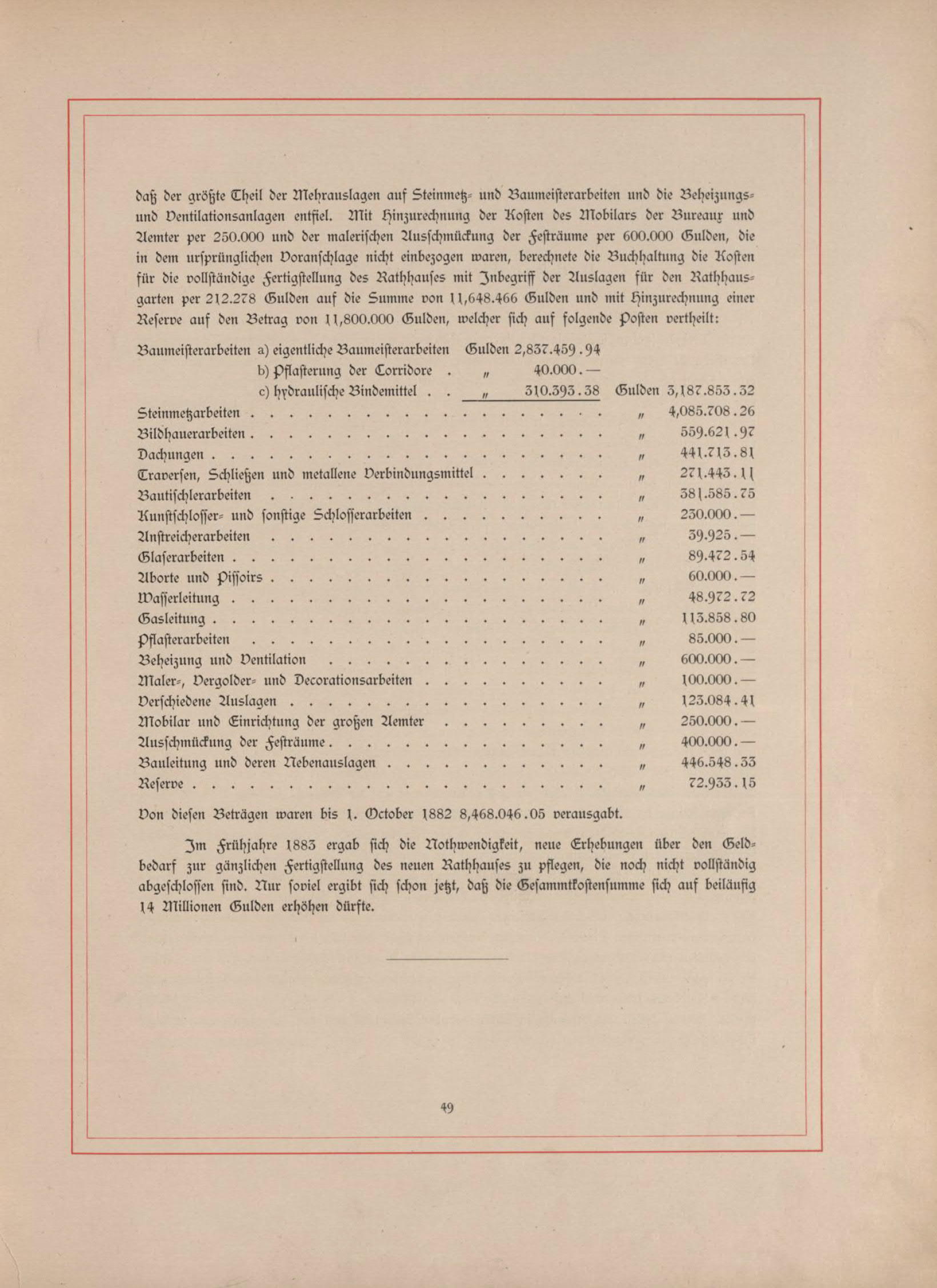 Und endlich konnte es auch mit dem Bau losgehen. Doch die Kosten für den Bau "explodieren". Nachdem die Stadt Wien für den Neubau ursprünglich 8,5 Mio. Gulden veranschlagte, hatte sich der Bau in der Endabrechnung auf 14 Millionen Gulden (=123 Mio. Euro/Stand 2002) erhöht. Allein 4,1 Millionen Gulden kosteten die Steinmetzarbeiten.