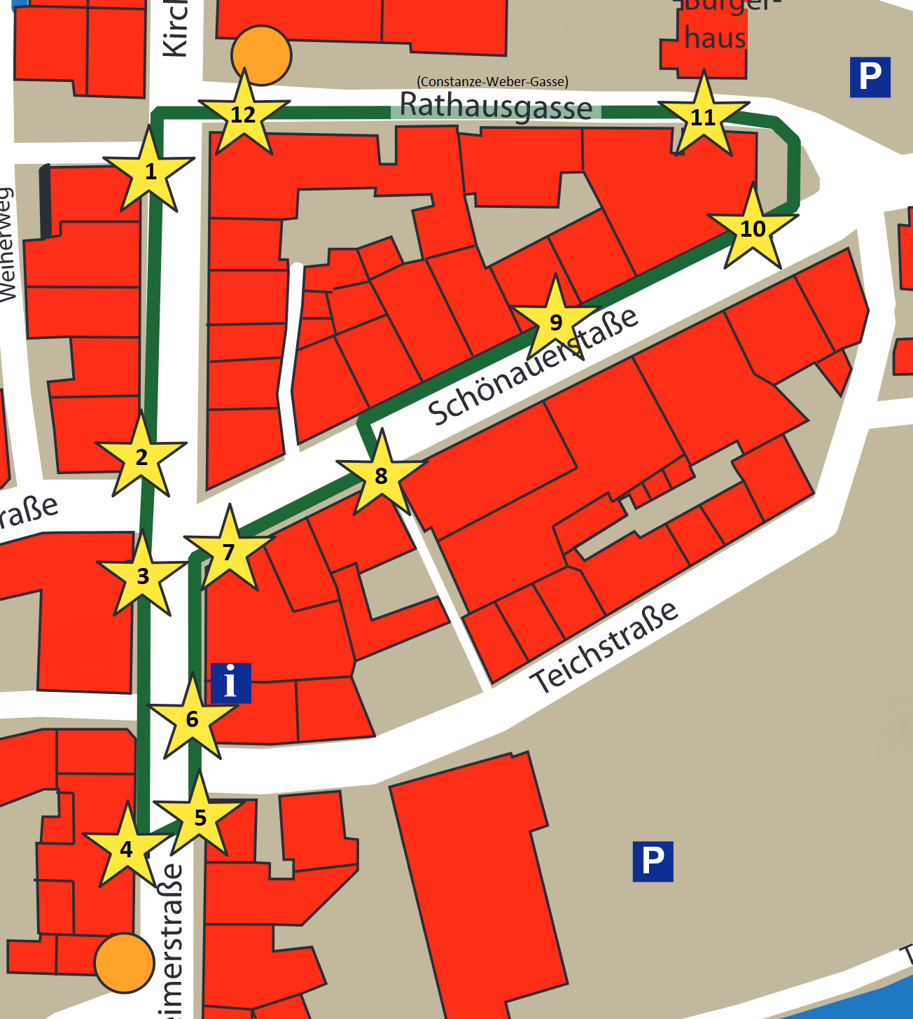 Go to the published coordinates. Search the ground for a plate containing a text beginning with "Constanze genoss...". This is the first of a total of twelve such plates. These plates will guide you along the Boulevard, so please follow them (start: walk southwards/in direction main road "Bundesstrasse" B317). If a the text changes direction this means also a change of direction for you - for example you will have to cross the street. The easiest way to orientate is to use the map in the listing (see above).