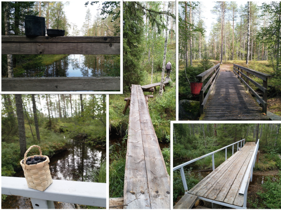 Your task is to take two photos. The first photo should be taken at the virtual cache coordinates, where you can find a newly made bridge. Take a photo of something you found, e.g. berries, or something that's yours, so that there is at least a part of the bridge in the picture as well. Take the second photo at the brdige next to campfire area at waypoint "Evästauko ja kuvauspiste (silta)". Again, let at least part of the bridge be seen in the picture. Please add something you eat or drink or maybe your drinking bottle in the picture. If you didn't eat anything, add something that's yours to the picture.