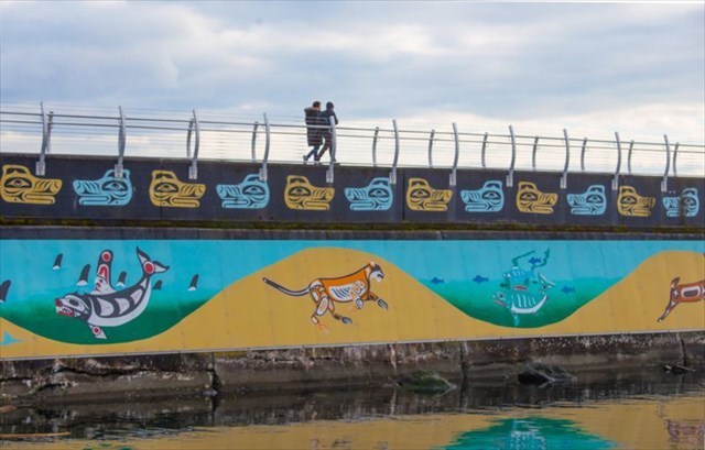 2) Walk 70 meters west to the first waypoint where you will find another panel directing your attention to the spectacular Land and Sea Mural created by members of the South Salish Esquimalt and Songhees Nations. The mural, Canada’s largest, transformed the breakwater into an eloquent bridge between cultures.