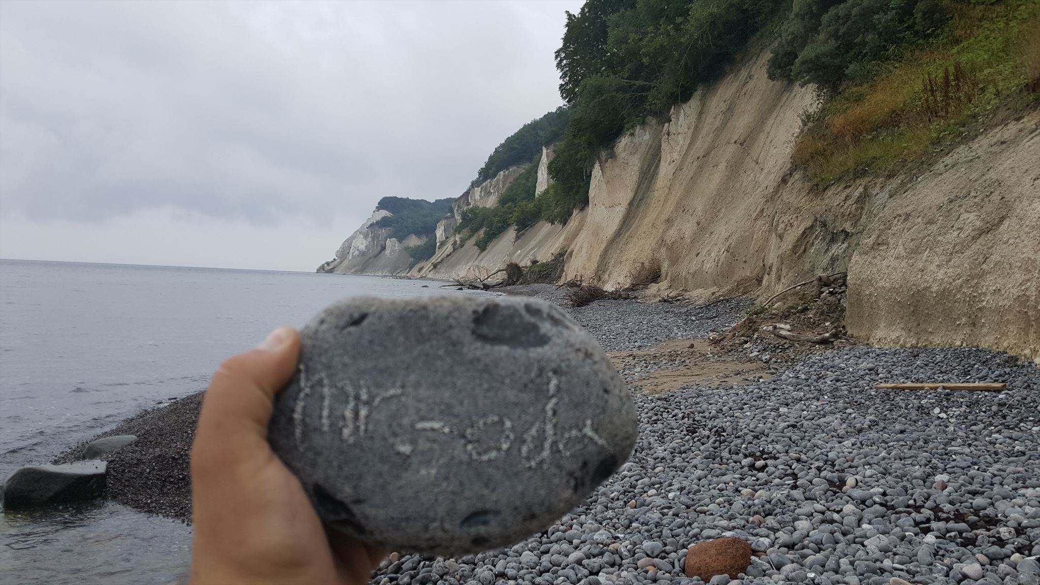Go to the beach at the botom of the cliffs. Walk along the beach to the coordinates. Find a blue rock or a piece of driftwood and use a piece of the chalk to write your geocaching name (alternatively use pen and paper). Take a picture where both the white cliffs and your name are visible and post this with your log.