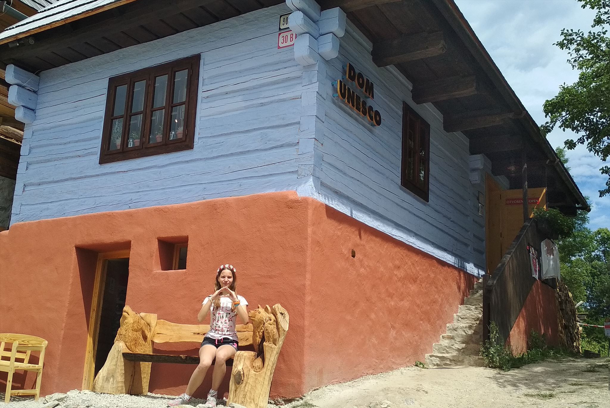 Stage2: Tu je dom UNESCO. Aj tu urobte fotografiu seba s domom v pozadí. No a kedže je to UNESCO, skúste rukami vytvoriť striešku ako na tunajších dreveničkách