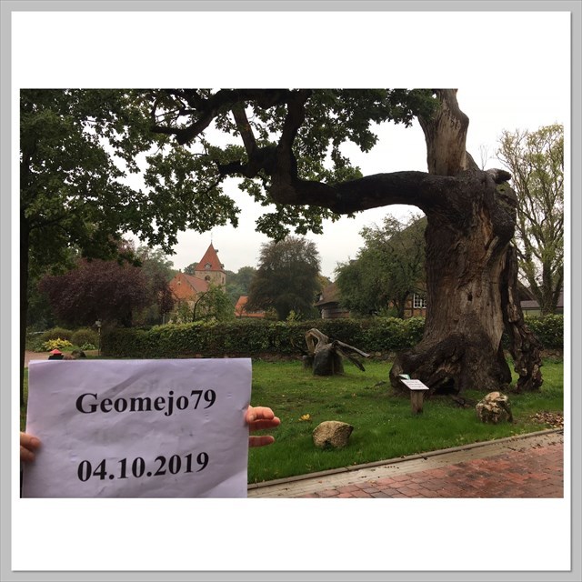 Standort des Logfotos um alle Stationen (1000-jähr. Eiche, St.Firminus-Kirche und Tabkenhof) gemeinsam auf einem Bild abzulichten. Auf diesem Foto muss ein deutlich lesbar beschrifteter Zettel o.ä. mit deinem Cachernamen und dem Datum deines Besuches zu sehen sein (siehe Beispielfoto im Listing). Dieses Foto muss als Logbedingung zum Online-Logeintrag hochgeladen werden.