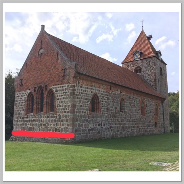 Begebt euch an die kurze Außenwand an der Rückseite der Kirche und zählt dort die großen Mauersteine der untersten Steinreihe über dem Sockel (siehe rote Linie auf dem Foto im Listing). Die ermittelte Anzahl setzt ihr an den Platzhalter F in die unten aufgeführte Mailadresse ein.