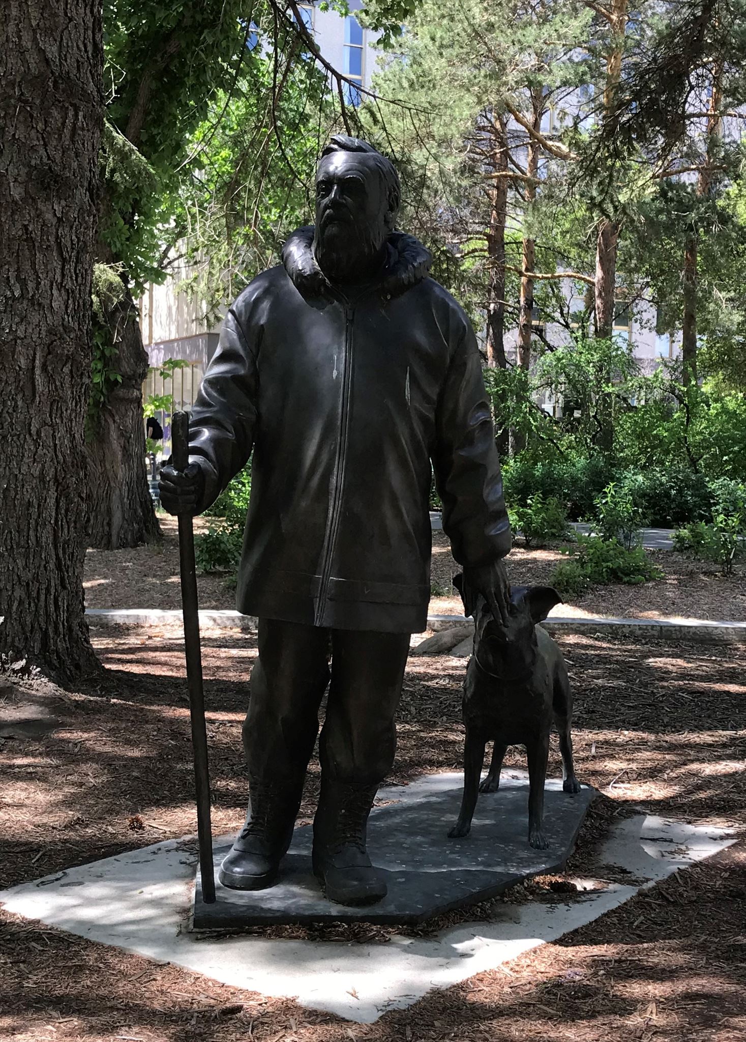 Not far off at N 52° 7.905' W 106° 38.195' is another favourite space, "created for visual enjoyment and as a place for contemplation and discussion." Amidst an island of mature spruce, it features a sculpture of renowned author, Farley Mowat and his beloved companion, Chester.