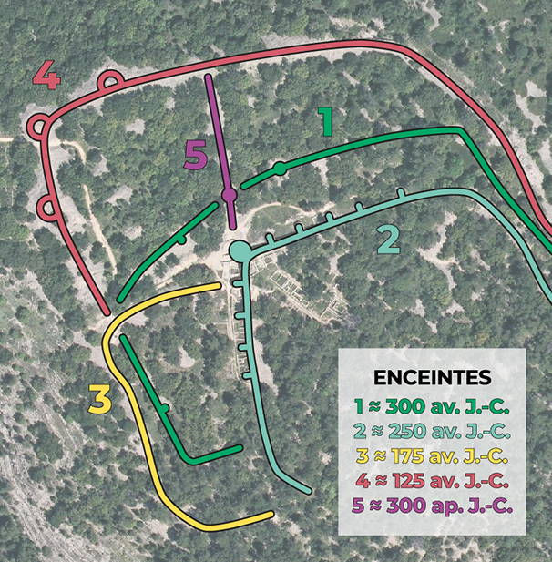Les photographies aériennes et l’étude des objets découverts lors des fouilles ont permis aux archéologues de dater les différentes phases de construction des murs d’enceinte.