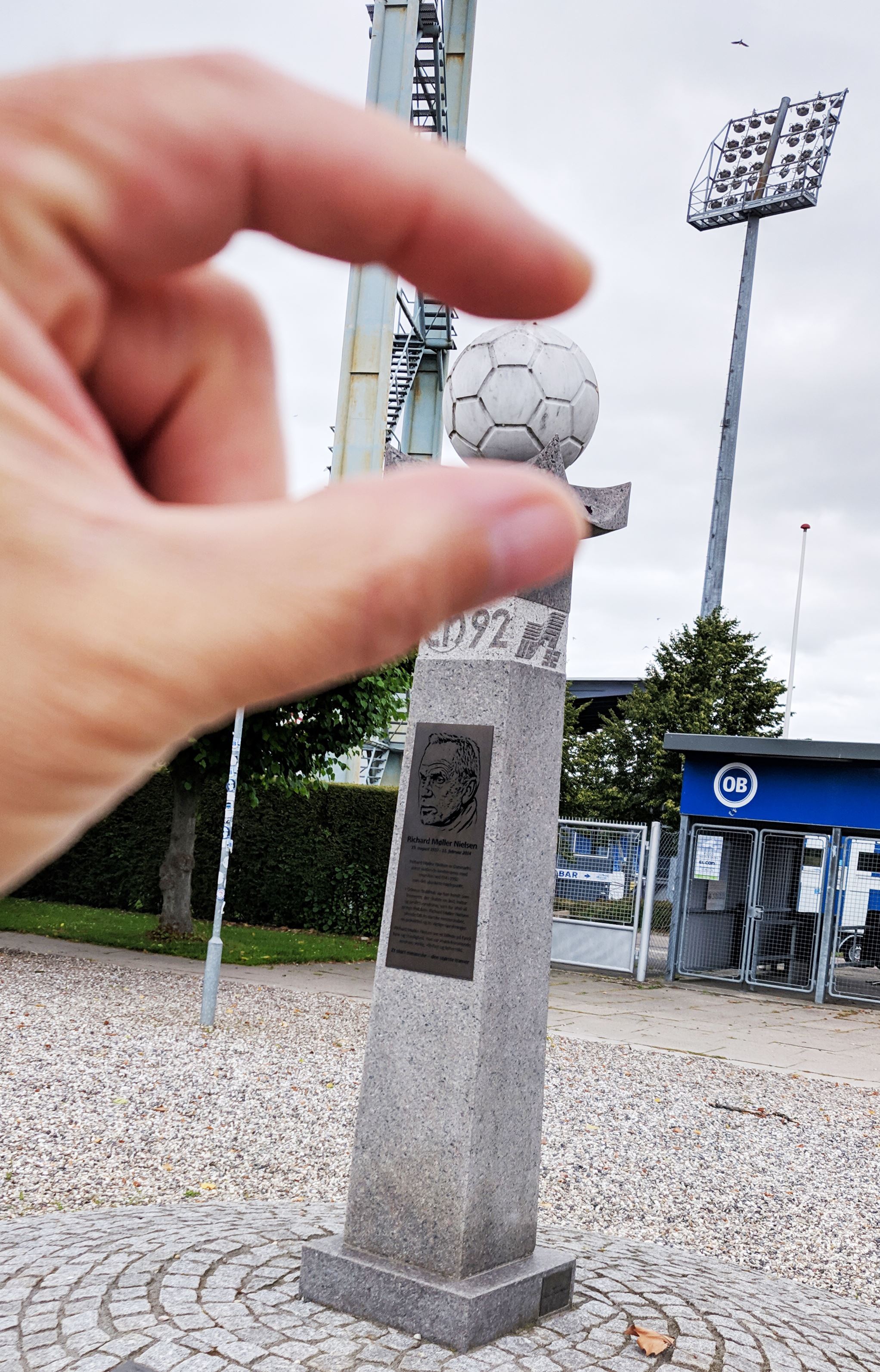 Tag et billede hvor man kan se mindesmærket hvor du holder bolden mellem fingerene (se foto), eller holder din gps, eller en selfi.