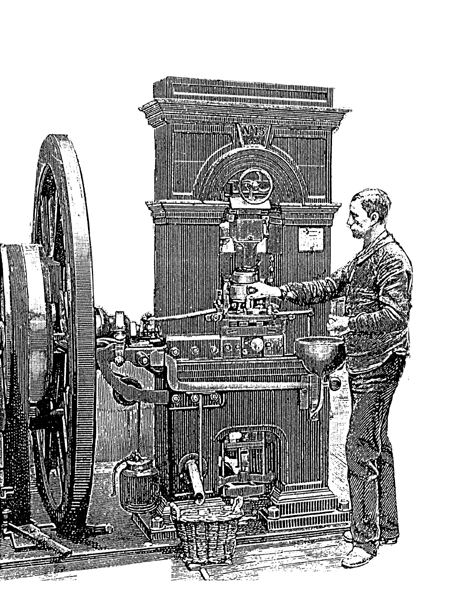 Esta foi comprada em Inglaterra à firma Boulton and Watt, idêntica à da Royal Mint de Londres. A partir de 1866, foram adquiridas as poderosas prensas monetárias da marca Ulhorn, antepassadas das que ainda hoje cunham o nosso dinheiro.